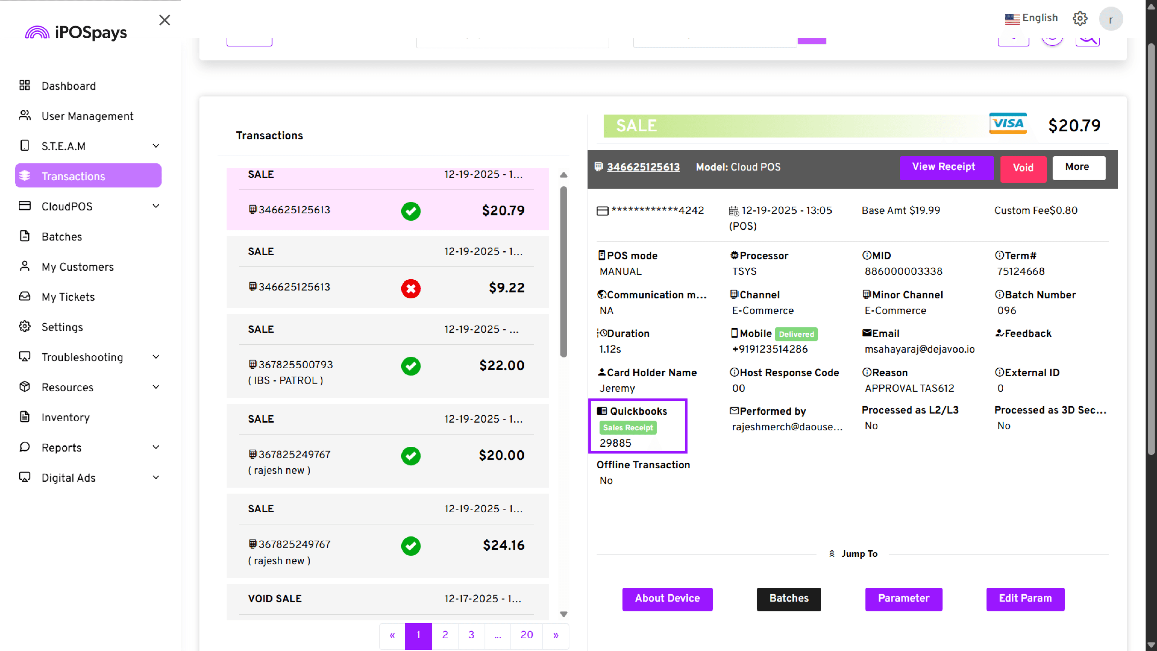 Once transactions are successfully synced from iPOSpays, merchants can view and manage them directly within QuickBooks Online under the Sales Transactions module.