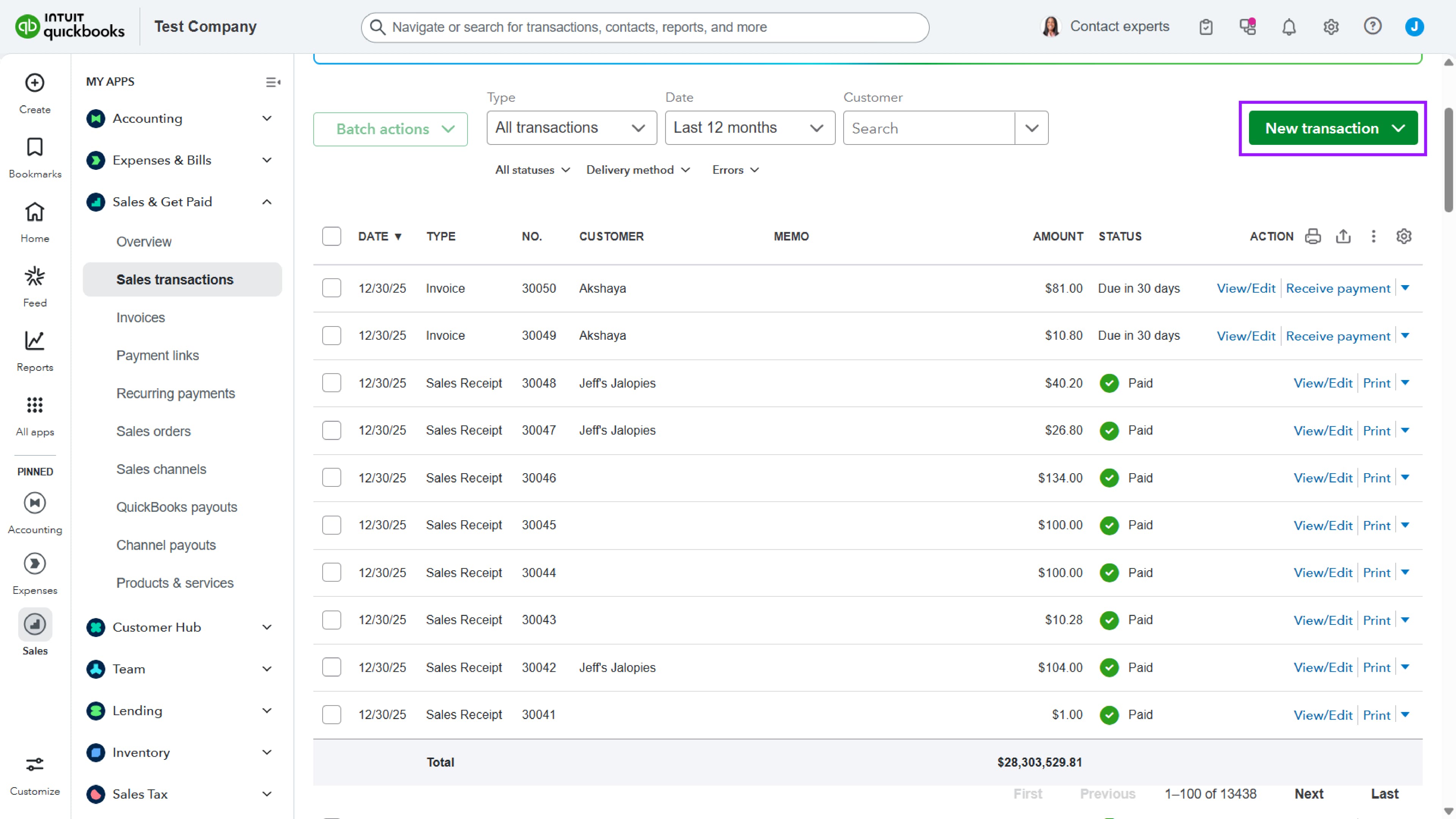 On the Sales Transactions page, click the New transaction button in the top-right corner.