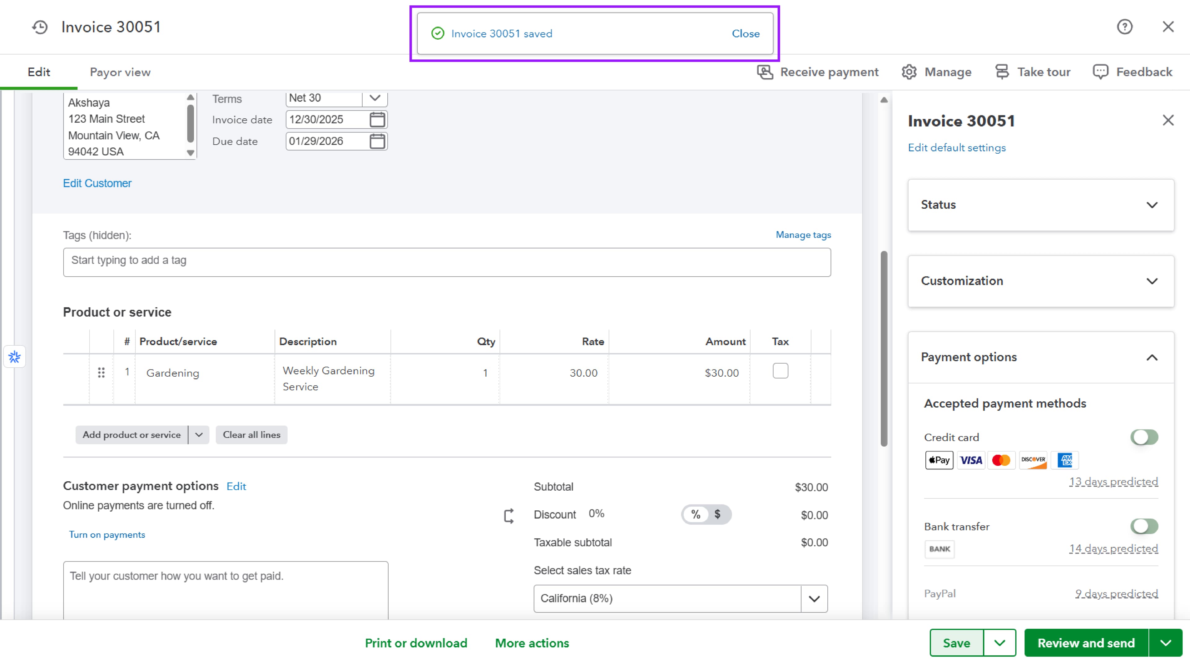 A confirmation message appears indicating the invoice has been saved successfully, and an invoice number is generated.